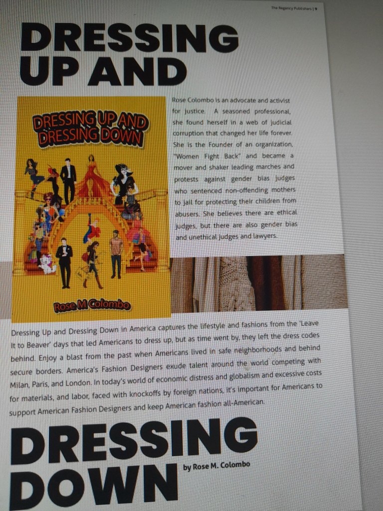 BOOK: Hot off the Press – May 2023 – Dressing Up and Dressing Down by Rose M Colombo – A blast from the past to the present. Explore how outsourcing, globalism, lockdowns, China, cotton, water, and textiles is affecting the American world of fashion and the challenges they must face today avilable in Beautiful Hard Cover for coffee table or entry, paperback and Kindle at amazon.com