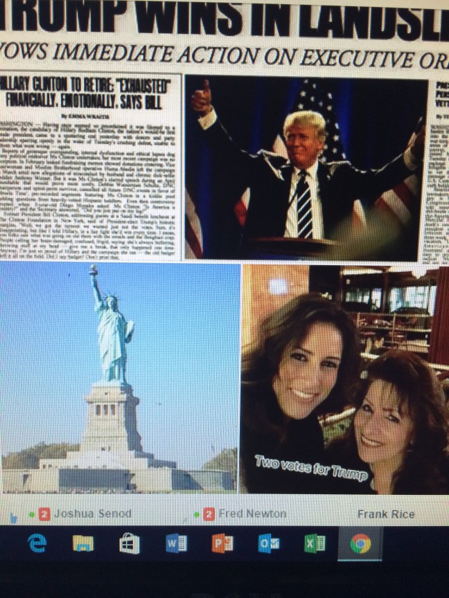 Anyway, let’s return to the Trump cocktail lounge where I met the young man on Trump’s campaign team. The lounge was closing and we said good-bye to the people we met. My daughter exchanged emails with the bartender and they are still friends to this day. I looked in the eyes of the young man, who was a member of Trump’s campaign team, and I said, “Promise me that you will get this message to Mr. Trump and his team. Tell them to use social media 24/7 and blast his face and message all over social media until the very end of the elections.”